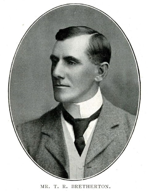 0ne of the most familiar figures in Bloemfontein today is that of Mr. TOM ROUGHEAD BRETHERTON, who is a native of Lancashire, where he was born in the year 1869, and is the fourth son of James Henry Bretherton, Esq., of Whiston Hall, Lancashire, and latterly of Crabwall Hall, in the county of Cheshire. Chester was the seat of his educational training, under private tutorship at King's College, and on the termination of same he commenced life by joining his brother in business as chartered accountant in Liverpool, and as such continued to practise for the succeeding three years when he joined Messrs. Higgins & Paton, Stockbrokers, of Liverpool.