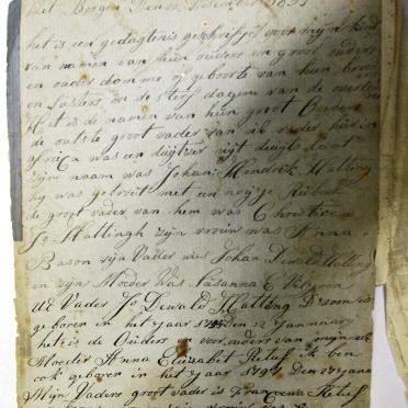 These pages with family information extracted from a collection of 70 handwritten pages, apparently in jumbled order, containing notes, prayers, sermons and a copy of a letter dated 1795 as from Marta Eliesabeth Joubert, getroud Retief. Given here are two groups of Family notes apparently written by Anna E. Retief, born 1797.