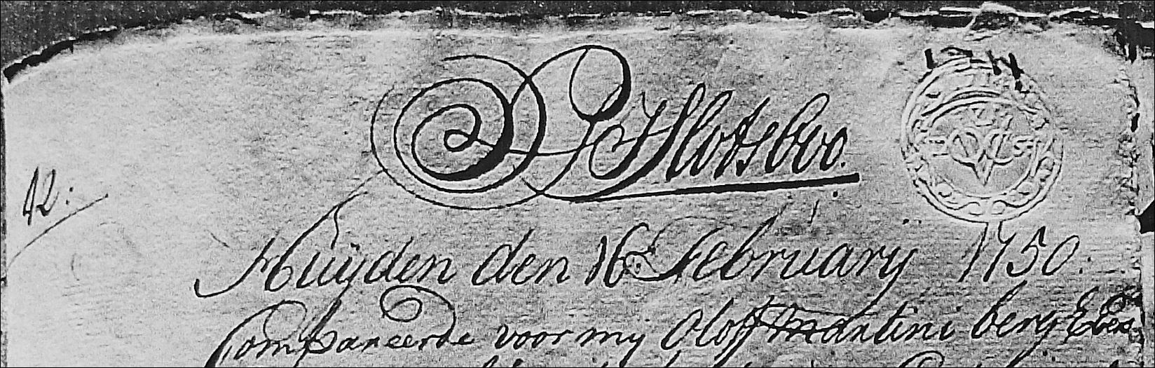 Contract of employment, drawn up before Oloff Martini Berg, secretary of the Council of Policy at the Cape of Good Hope, between the former councilor (Heemraad) Daniel van der Lid, represented here by the assistant Tobias Jan de Vlamingh, and the soldier Fredrik Deijtzeijl of Elsen. Fredrik Deijtzeijl is to serve Daniel van der Lid as servant (knegt) and general farmhand for a period of one year in exchange for a monthly pay of twelve guilders, Indian valuation, as well as boarding and lodging. The company maintains the right (should the need aries) to suspend the contract and recall the soldier to resume his former duties. The contract is dated 16 Feb 1750, however the second page where the contract was witnessed and signed, was not available for transcription. The contract is supplemented by an anullment dated 26 Feb 1753, suggesting that the original contract was extended twice. These pages however were also unavailable.