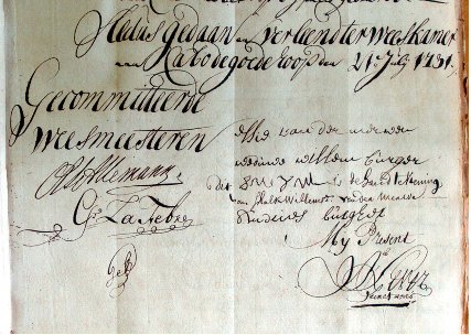 3) Corney Keller adds: This declaration was (indirectly) required by the commissioners of marriage affairs (huwelijkshof) by all widows or widowers (with minor children or heirs of the deceased) with intent to remarry. By indirectly I mean the deed was required by the Orphan Chamber (Weeskamer) which then supplied a declaration to the marriage commissioners stating that the bride or groom to be had fulfilled their obligations to the minors. For instance the note on each of the two entries from the Amsterdam Ondertrouw (marriage notices) register, top left corner reads ‘Weeskamer voldaan ’ plus the date: